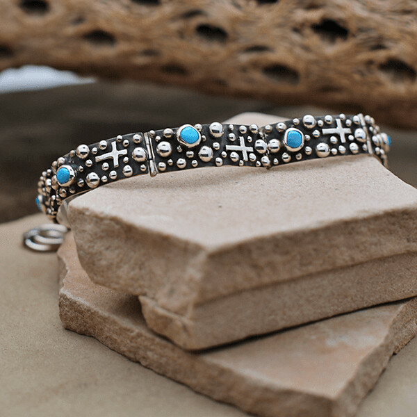 Navajo handcrafted link bracelet by Navajo artist Akee Douglas. Set in solid sterling silver with genuine Kingman Turquoise stones. Each of the 5 links measure 1" 3/8 in length and is approximately 1/2" in width. The overall length is adjustable with the T-bar clasp, making it easy and comfortable to wear. The unique design of the "Rain Drop" pattern make this piece stand out from the rest. Navajo handcrafted link bracelet by artist Akee Douglas Kingman Turquoise originates in the Mineral Park Mining District near Kingman, Arizona. One of the largest domestic turquoise mines, it is found in a large open pit copper mine in the high desert country. The Kingman Mine district was first mined by Native Americans; it was part of the most extensive prehistoric workings in Arizona.